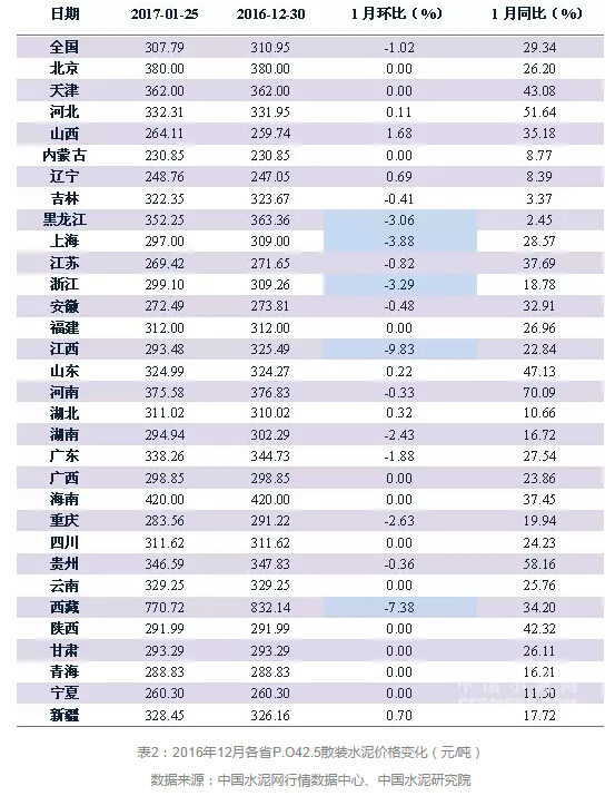 2017年1月份,全國共有13個省市自治區水泥價格環比下降,其中,江西、西藏跌幅最大,分別下降了9.83%和7.38%,另外有6個省市自治區水泥價格小幅上調。全國范圍內絕大部分地區水泥價格都沒有出現變化或僅有小幅局部波動,市場行情進一步淡季趨穩。