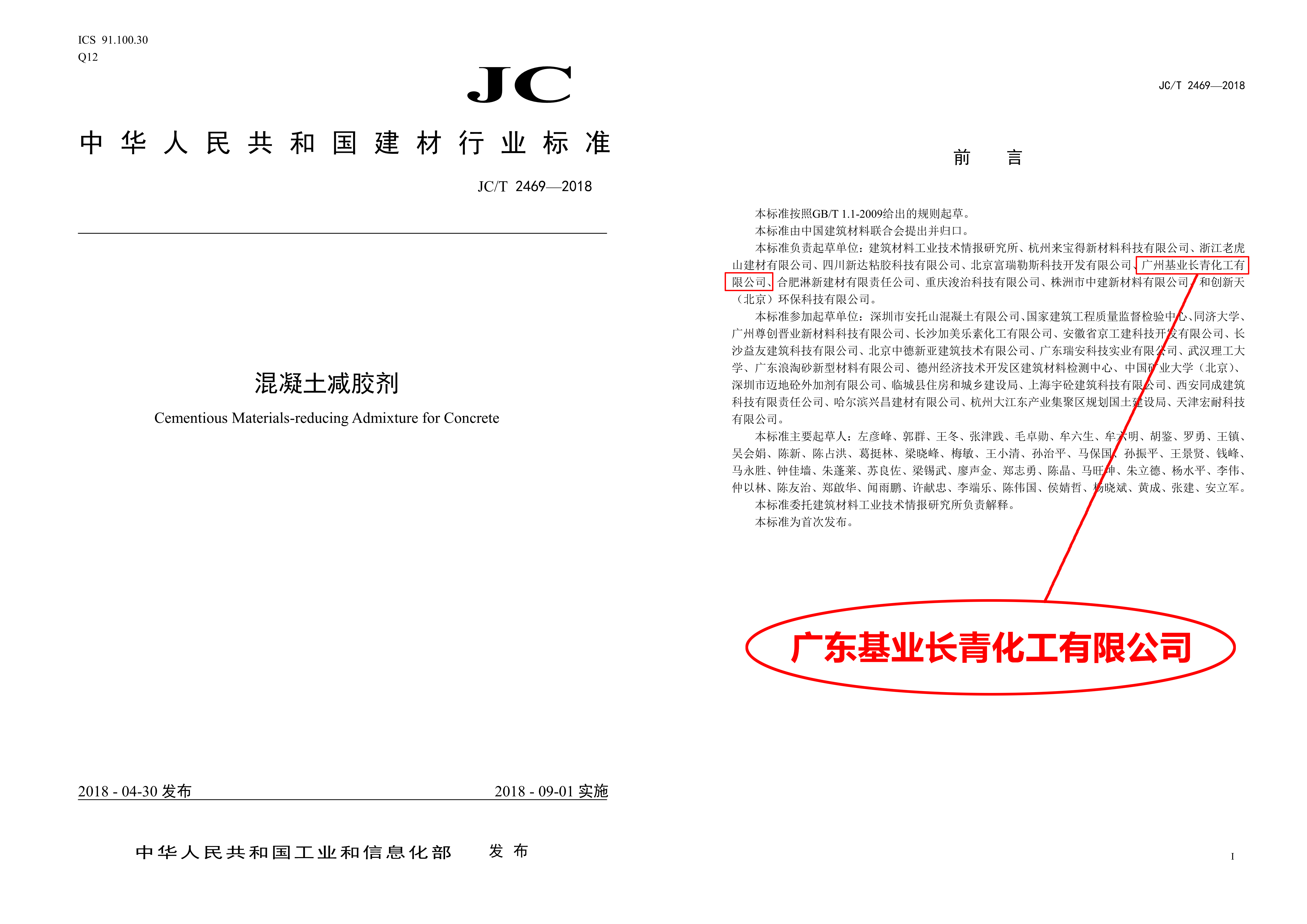 從2015年起,經過三年多時間的反復研討及審查,建材行業標準JC/T 2469—2018《混凝土減膠劑》終于在2018年4月30日,正式發布了。作為標準主要起草單位之一,基業長青積極履行促進行業標準化的職責,全程參與編寫制訂了混凝土減膠劑的術語和定義、標記、要求、試驗方法、檢驗規則以及包裝、貯存等方面的內容。