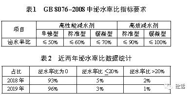 隨著行業(yè)技術的不斷進步,混凝土外加劑性能大幅提高,而GB8076-2008并沒有緊跟時代的步伐,其中泌水率比的指標要求針對現(xiàn)階段外加劑產(chǎn)品性能制定得太過寬松,不能有效控制摻外加劑混凝土的保水性能。GB8076-2008中規(guī)定如表1所示,泌水率比最高要求為≤50%;根據(jù)實驗室2018年和2019年數(shù)據(jù)統(tǒng)計,如表2所示,在所有檢測的外加劑中泌水率比并沒有出現(xiàn)不合格現(xiàn)象,泌水率比為0的情況占到90%以上。