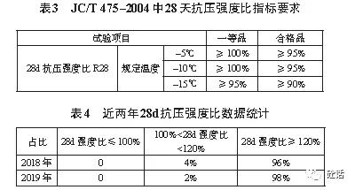 JC/T475-2004中28天抗壓強度比指標無約束意義,可有可無。受檢混凝土與基準混凝土同樣都是標準養(yǎng)護28d,而受檢混凝土由于摻入防凍劑具有良好的減水作用,因此抗壓強度之比的數(shù)值定會大于100%。而標準中規(guī)定如表3所示,28天抗壓強度比最高要求為≥100%;根據(jù)實驗室2018年和2019年數(shù)據(jù)統(tǒng)計,如表4所示,在所有檢測的防凍劑中28天抗壓強度比并沒有出現(xiàn)不合格現(xiàn)象,28天抗壓強度比≥120%的情況占到90%以上。因此針對防凍劑的用途而言,受檢負溫混凝土在規(guī)定溫度下負溫養(yǎng)護7d再轉標準養(yǎng)護28d的抗壓強度與基準混凝土標養(yǎng)28d抗壓強度之比更具說服力,28天抗壓強度比可直接取消,亦可提高其指標要求值。