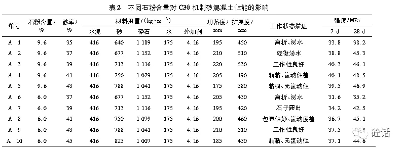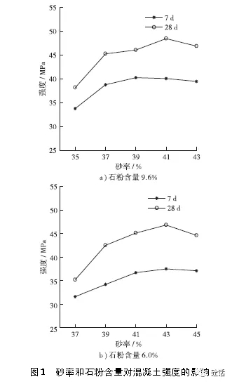 1)機(jī)制砂的砂率對(duì)混凝土的工作性能和強(qiáng)度會(huì)造成較大影響,因此砂率的選取,除了需要考慮機(jī)制砂的顆粒級(jí)配、細(xì)度模數(shù)外,還應(yīng)充分考慮石粉含量的影響。對(duì)于C30混凝土,石粉含量為9.6%時(shí),最佳砂率為39%;石粉含量為6%時(shí),最佳砂率為43%。