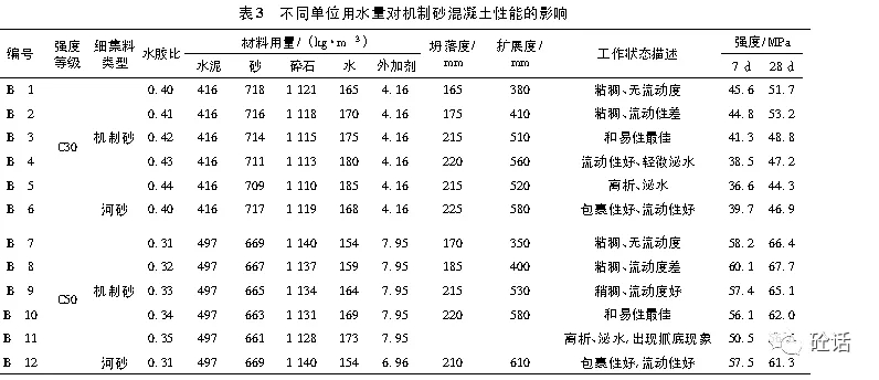 綜上所述,由于機(jī)制砂混凝土的強(qiáng)度高于天然河砂混凝土的,同等水膠比條件下強(qiáng)度明顯富余充足,因此進(jìn)行配合比設(shè)計(jì)時(shí),在保持膠凝材料不變的情況下,用水量可以在河砂的基礎(chǔ)上適當(dāng)提高7~15kg/m3,其強(qiáng)度仍能滿足設(shè)計(jì)要求,并能讓混凝土拌合物達(dá)到良好的工作性能。