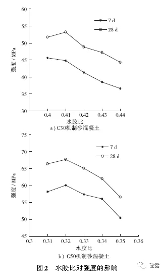 圖2為2種機(jī)制砂混凝土中不同水膠比對(duì)強(qiáng)度的影響。從試驗(yàn)結(jié)果可以看出: