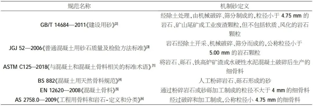 目前,國內外標準規范中機制砂的定義并不統一,不同國家的機制砂定義各不相同,國內各標準中機制砂的定義也不同,詳見表1。