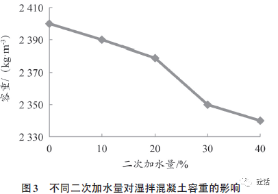 通過試件成型時濕拌混凝土體積的測定和質量的稱量,最終得出不同二次加水量與混凝土容重間的關系圖,見圖3。