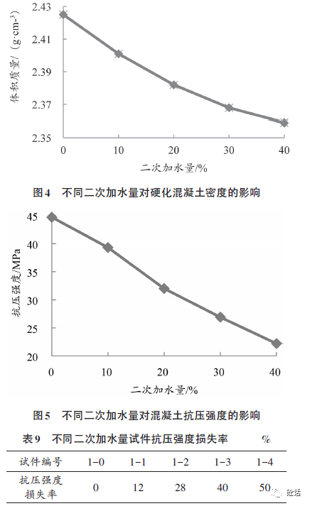 在骨料、膠凝材料和外加劑保持不變,測完坍落度后短時內的二次加水,對濕拌混凝土容重、硬化混凝土體積質量和抗壓強度的影響趨勢基本一致,都是隨著二次加水量的增大而減小,但二次加水量與硬化混凝土抗壓強度間只是局部線性相關,二次加水20%時,硬化混凝土的抗壓強度降低30%,二次加水40%時,硬化混凝土抗壓強度可降低50%。